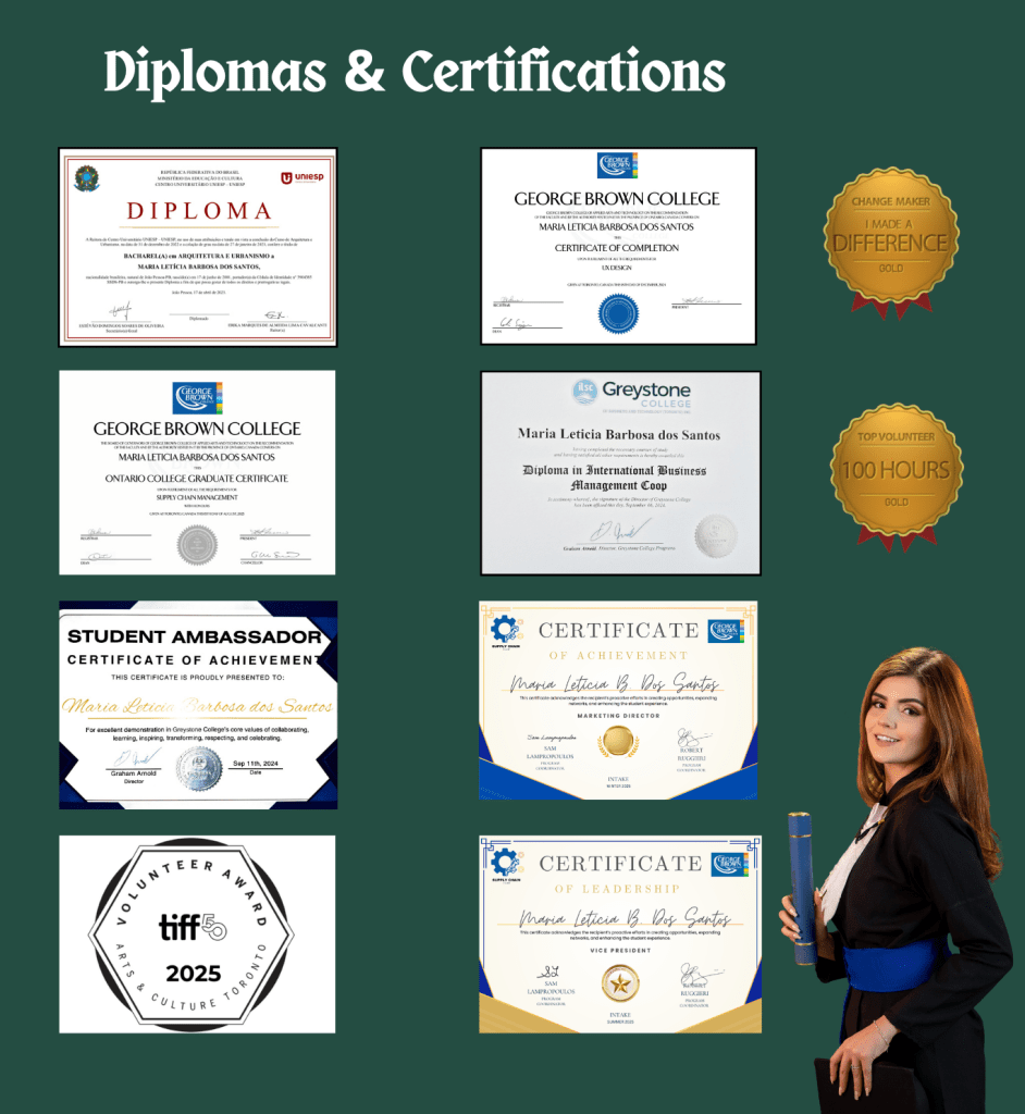 I hold a Bachelor’s Degree in Architecture and Urbanism, a Postgraduate Certificate in Supply Chain Management from George Brown College, a Continuing Education Certificate in UX Design, and a Diploma in International Business Management. This interdisciplinary background allows me to approach projects with a balance of strategy, creativity, and problem-solving.