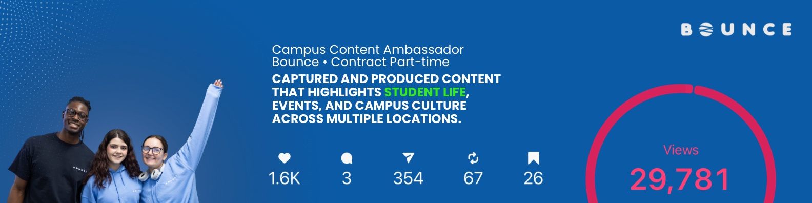 Through this journey, I was recommended to also work with Bounce, where I further developed my skills in student engagement, visual storytelling and a viral video!